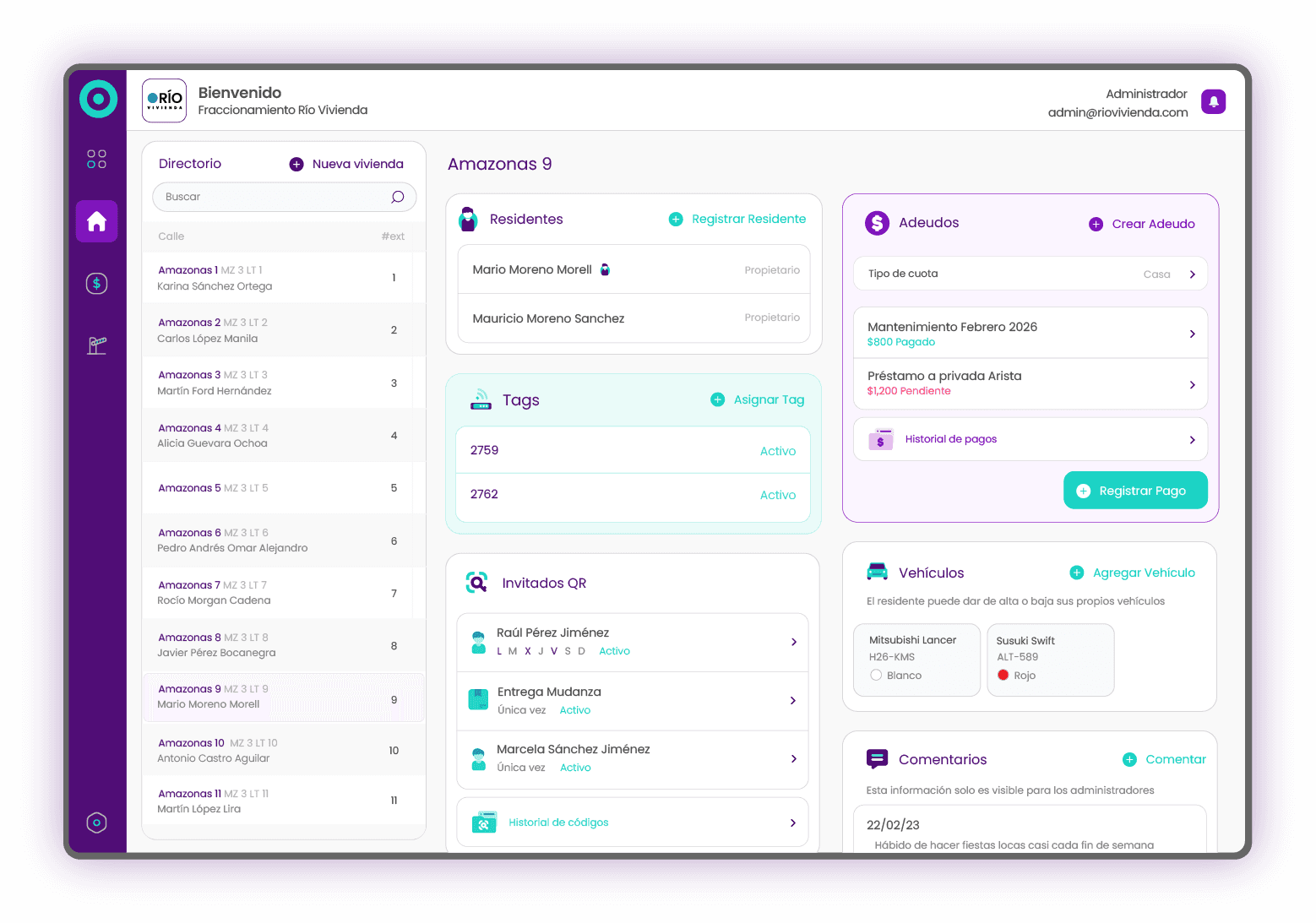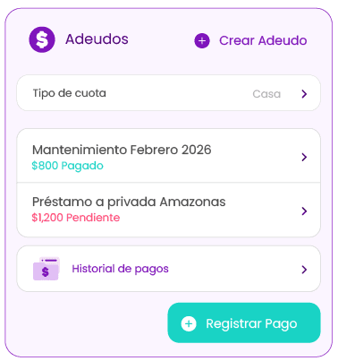 Mantén el control financiero de cada vivienda, podrás ver el historial de pagos, configurar montos, fechas para morosidad y asignar cuotas extraordinarias por vivienda para un mejor seguimiento.